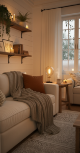 Lighting is as important as furniture when designing for coziness. Warm bulbs and thoughtful fixtures turn a room into a calm retreat.